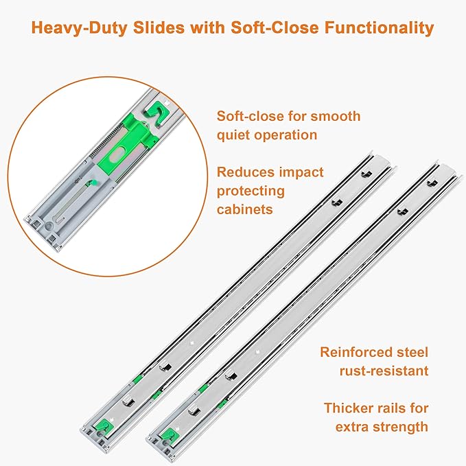 - Smooth and Sturdy Sliding System - Equipped with heavy-duty, soft-close ball-bearing slides, this cabinet pull out shelves ensure quiet and effortless operation. Built to support up to 100 lbs, it’s perfect for storing heavy cookware, mixer, and kitchen essentials
