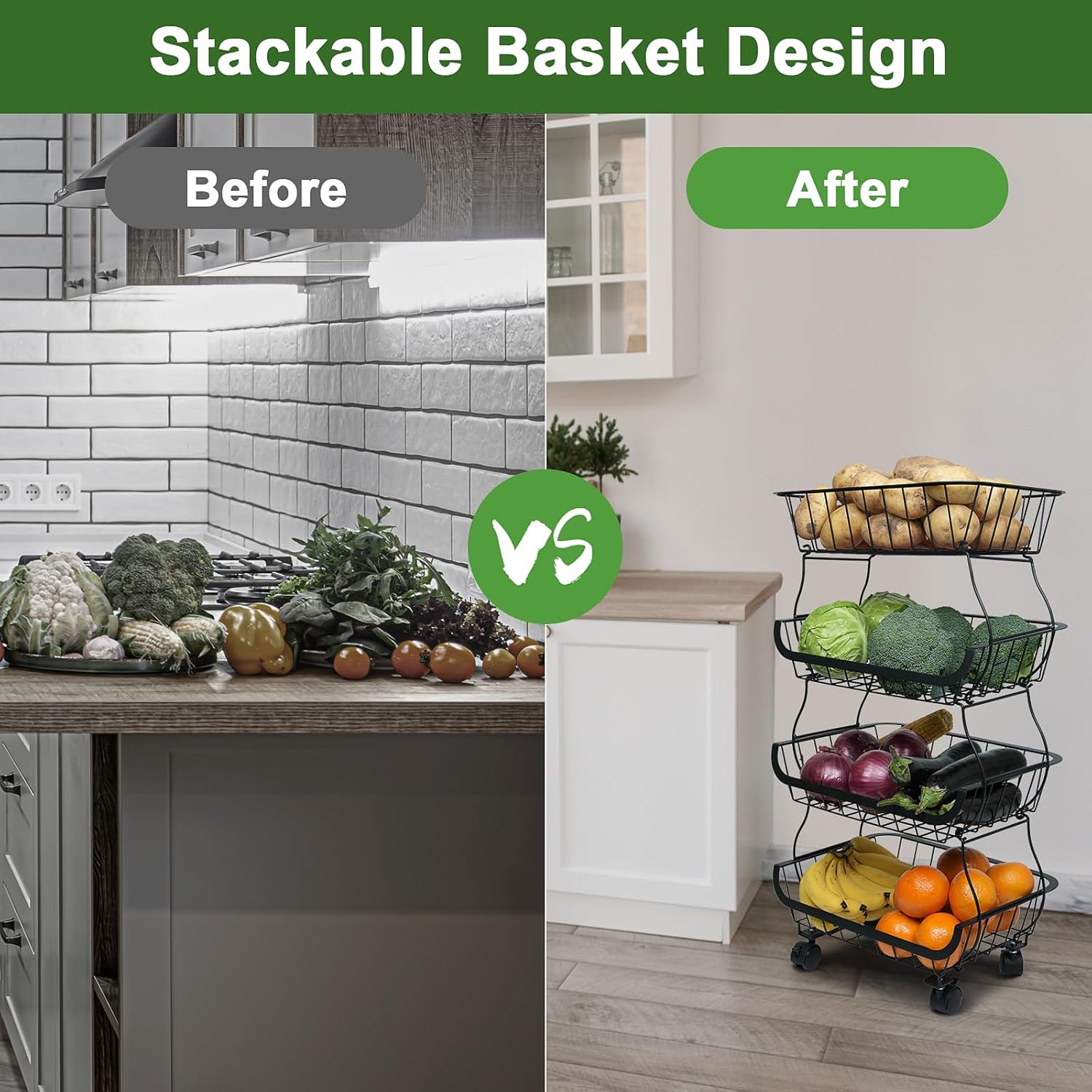 Fruit Vegetable Storage Basket, Kitchen Fruit Vegetable Storage Cart, 4 Tier Stackable Metal Wire Storage Baskets with Wheels, Produce Basket Organizer Bins for Pantry, Bathroom, Black