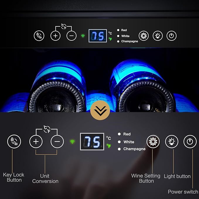 - [Intelligent APP Control] This wine cooler features a built-in wireless chip, enabling remote control via your smartphone. Easily manage the interior light, adjust temperature, and Lock the control panel. The app offers 3 preset modes for red wine, white wine, and champagne, allowing you to set the optimal storage temperature for your drinks with just one tap