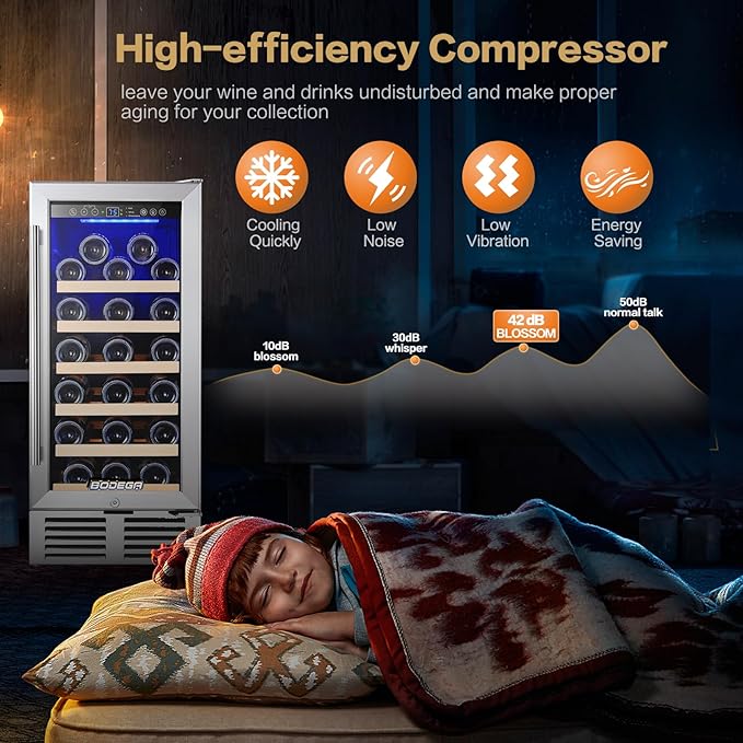 - [41-68°F Low Noise Compressor Cooling] This Wine refrigerator features an adjustable temperature range of 5-20°C (41-68°F) with an accuracy of 1°C/°F. BODEGA's carefully selected compressor ensures rapid cooling while maintaining an operating noise level of just 42 dB. You can safely place this wine refrigerator in bedrooms, kitchens, or offices without worrying about noise disrupting your daily life.