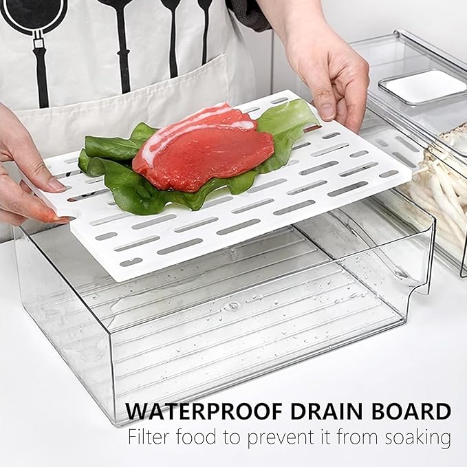 - HUMANIZED DESIGN - The transparent food storage organizer design allows you to easily find the storage content you want; The drain board and drainage holes at the bottom can filter excess water in the ingredients to keep food fresh, help reduce odors in vegetable storage