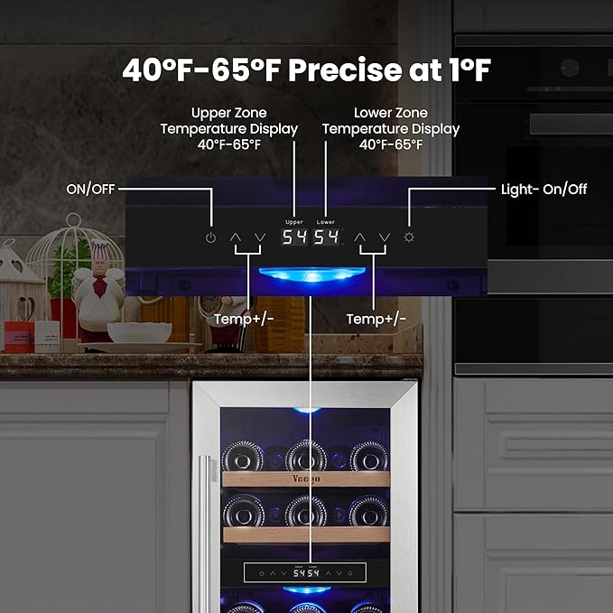 - 【WINE FRIDGE DUAL ZONE】Our dual-zone wine cooler offers independent temperature controls with adjustable settings from 40°F to 65°F. Perfect for storing red, white wines, and champagne at their ideal temperatures, helping to preserve both flavor and freshness.