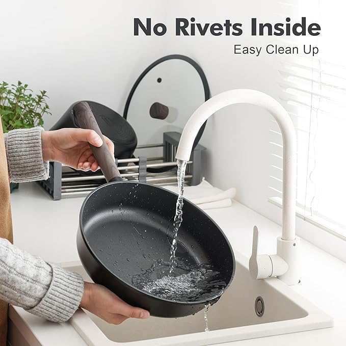 - Swivel Stay-cool Handle: The swivel handle, rotatable metal hook and flat lid make the nonstick black cookware set convenient for hanging or stacking, up to 70% space-saving storage. The woodgrain bakelite handle is comfortable to grip and stays cool while cooking.