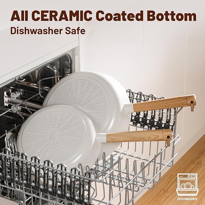 - All Ceramic Coating: Internal ceramic coating for safe,healthy and non-toxic cooking with less oil. Free of intentionally added PFAS/PTFE/PFOA/lead/cadmium. This non toxic cookware set will not produce toxic fumes even overheated. External ceramic coating ensures ease of cleaning and greater stain resistance.