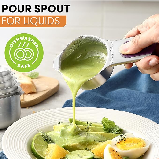 - Complete Set Of Cups With All The Common Sizes You Need - You'll be able to make almost anything with the included sizes - 1/8 cup, 1/4 cup, 1/3 cup, 1/2 cup, 2/3 cup, 3/4 cup, and 1 cup.