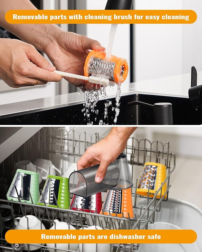 - ⌛[EASY TO CLEAN, DISASSEMBLY] A cleaning brush is included, simply remove the blades and inlet for cleaning, the removable attachments are all dishwasher safe and can be cleaned directly without annoying cleaning steps. The base of the cheese grater can simply be wiped with a damp cloth, do not put it under water.