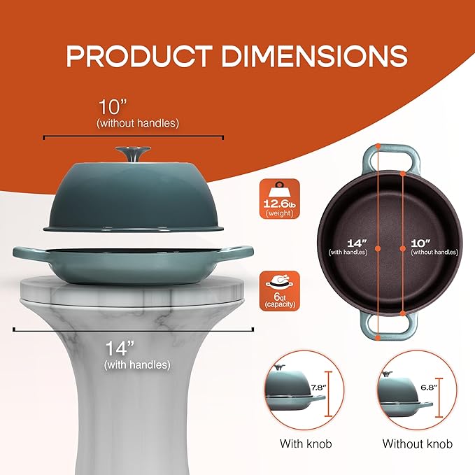 - ULTIMATE DUTCH OVEN SET: Krustic enameled cast iron Dutch oven brings a game-changing innovation to your kitchen! Measuring 14" in diameter with handles, 10" without handles, 7.8" high with the knob, and 6.8" without the knob and weighing 12.6 lbs, this 6 quart pot with lid is a perfect size to create your culinary masterpiece. Our bread oven includes a non-stick, easy-to-clean, dishwasher-safe silicone mat sized 21.4" x 8.2", a care manual, and a homemade recipes book.