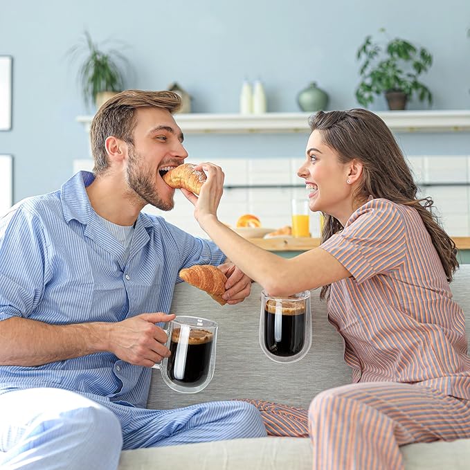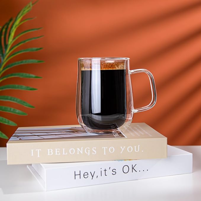 - 【Comfortable】 The double walled glass coffee mugs features a rolled edge design that perfectly fits your lips, enhancing the experience of tasting coffee flavors. Unlike common double-layered glass coffee cups on the market, the handle of this cup is specially designed to accommodate various hand sizes.