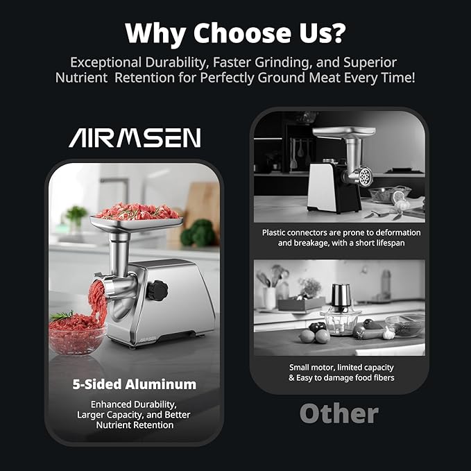 - 【High-Efficiency Grinding】The AIRMSEN electric meat grinder features a 2500W peak power pure copper motor and triple spiral extrusion technology, ensuring efficient cutting and grinding. It can process approximately 2kg of ingredients per minute, effortlessly handling tough meats, vegetables, and fruits. This high-performance meat grinder significantly reduces cooking time while preserving meat freshness and minimizing fiber loss, making it perfect for home kitchens and meal prep enthusiasts
