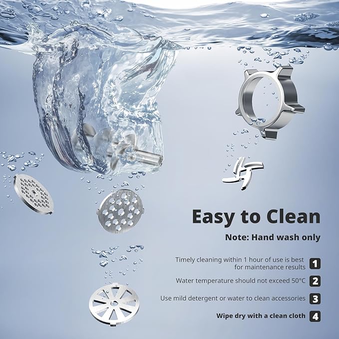 - 【Easy to Clean】All components, including the blade, grinding plates, and hopper, are detachable and dishwasher-safe for hassle-free cleaning. To prolong its lifespan, apply a small amount of vegetable oil to the blade and plates after washing to prevent rust. Re-clean before use to ensure hygienic food preparation