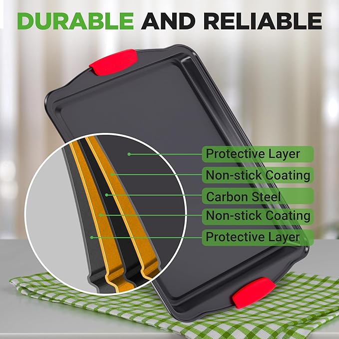 - EASY TO USE AND CLEAN - Designed with convenience in mind, these durable cookie sheets are easy to clean and dishwasher-safe. The non-stick surface makes food preparation and serving a breeze, while the silicone handles provide a secure grip.