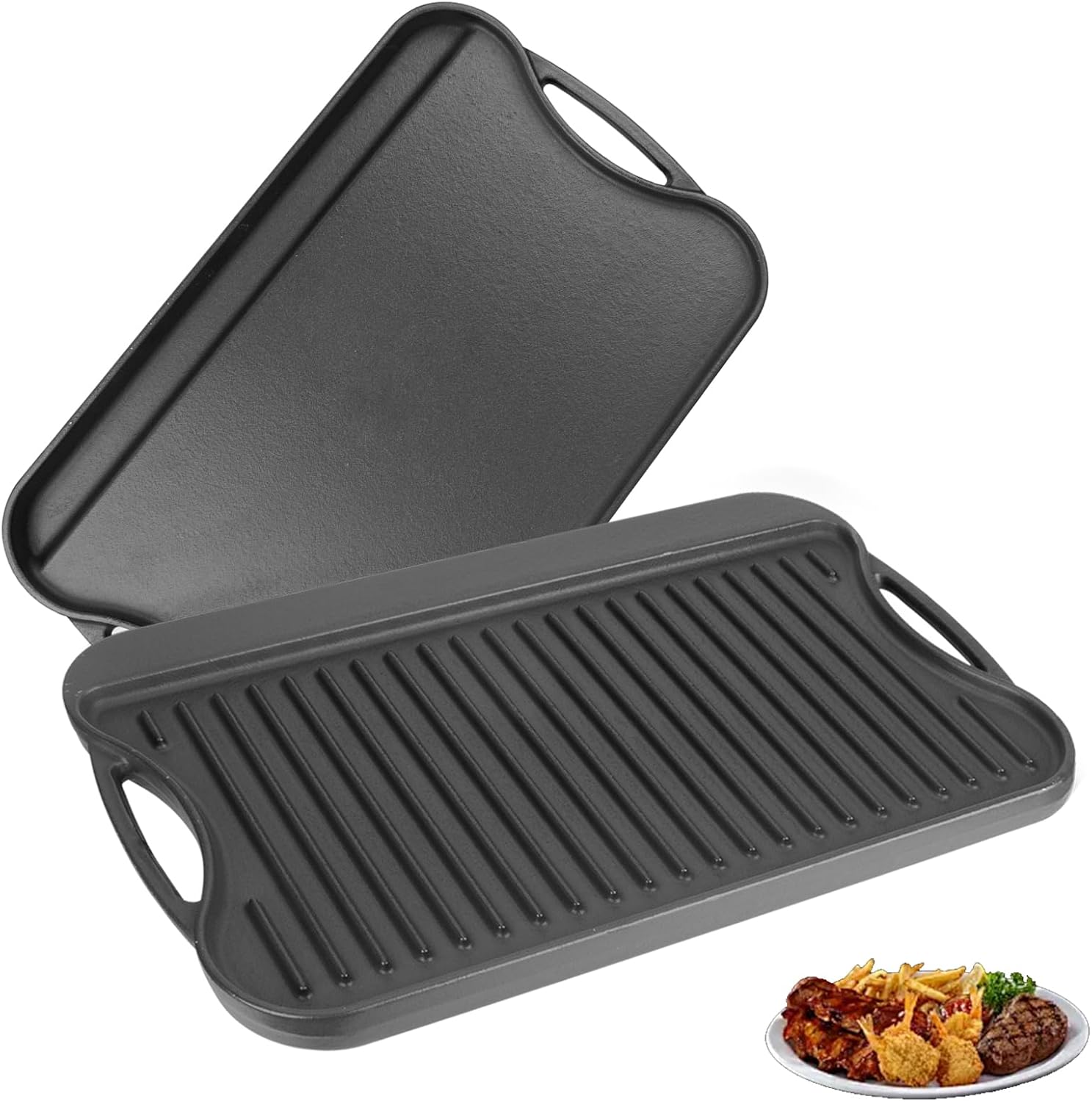 2 in 1 Reversible Cast Iron Griddle for Gas Grill, Flat Top Grill Pan for Gas Stove, Pre-Seasoned Oven Top pan,Upgrade Double Burner Griddle for Indoor & Outdoor Cooking Accessories, 17" X 10"