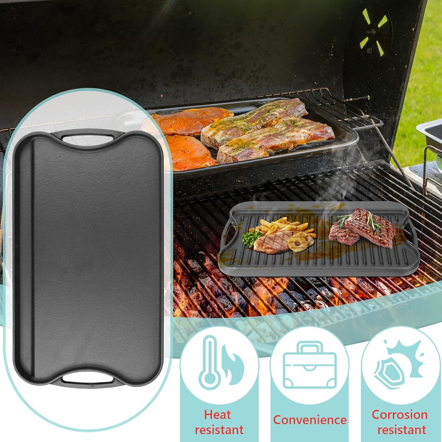 - MULTIFUNCTIONAL: Suitable for most stovetops, gas grills, ovens, etc., the reversible design allows it to be utilized on both sides, the flat side is perfect for cooking eggs, veggies, pancakes, etc., and the fluted side is perfect for steaks, bacon, and other kinds of meats. Perfect flat top griddle pan meets your multiple cooking needs, a necessity in your kitchen!