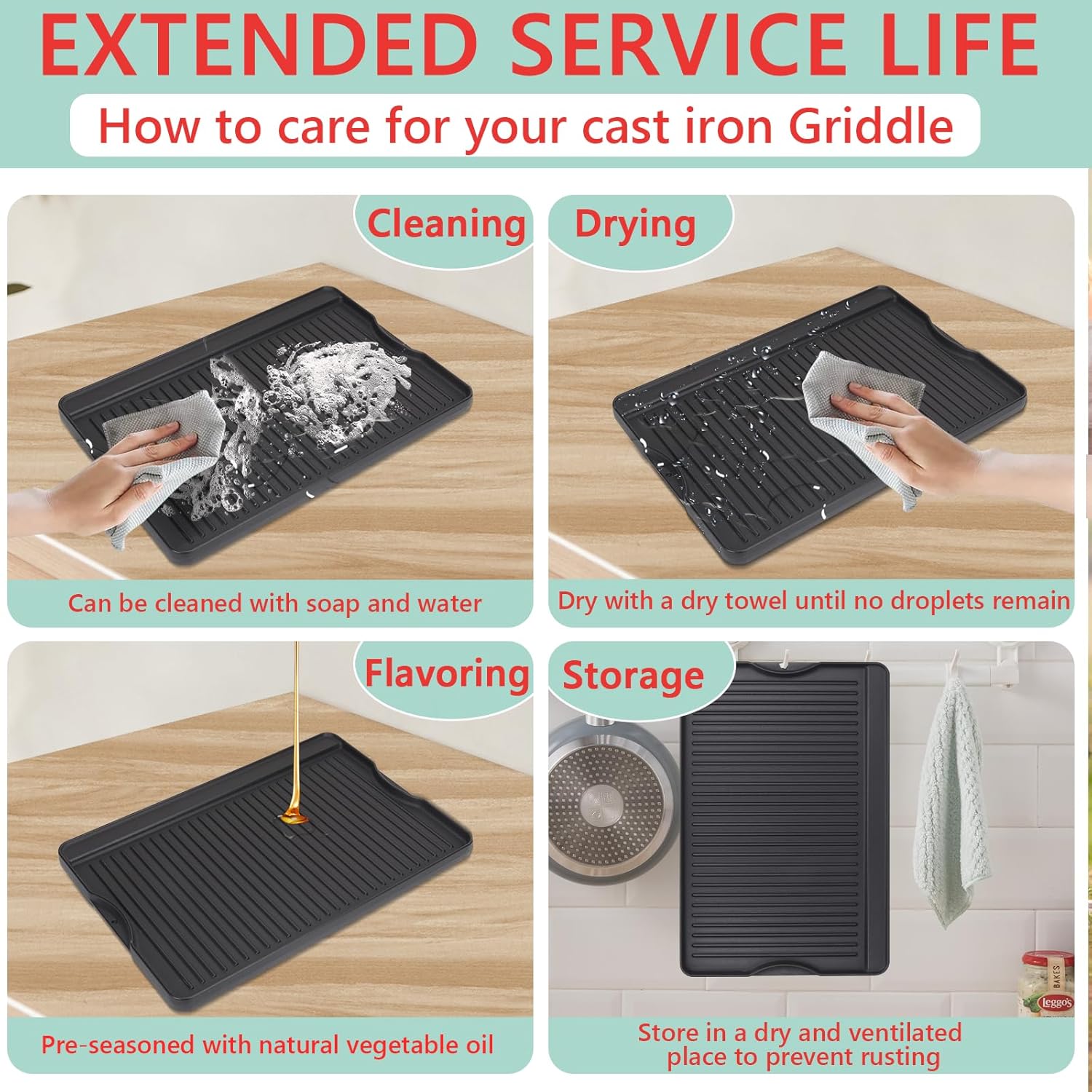 - EASY TO CLEAN: After seasoning with cooking oil before use, the cast iron will form a non-stick surface, very easy to clean. How to store: After use, please dry the product surface water stains, and then apply oil to protect it, to prolong the life of the product. Lets you master fresh and flavorful dishes.