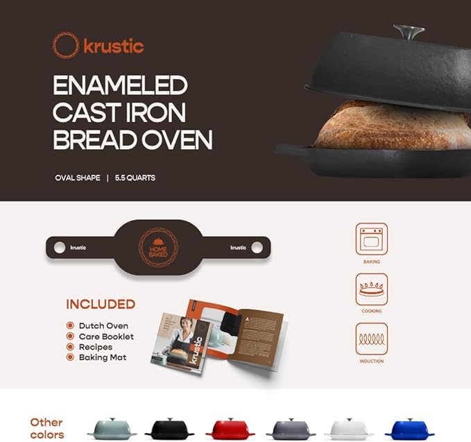 - PERFECT BAKING: Krustic professional dutch oven for bread baking features an innovative dome design that creates optimal steam circulation, helping your sourdough to achieve the perfect rise and golden crust every time. The specially engineered with 5.5-quart capacity and precise temperature control make this cast iron cookware essential for both novice bakers and seasoned professionals.