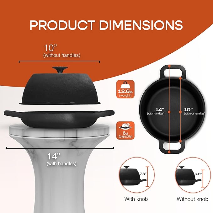 - ULTIMATE DUTCH OVEN SET: Krustic enameled cast iron Dutch oven brings a game-changing innovation to your kitchen! Measuring 14" in diameter with handles, 10" without handles, 7.8" high with the knob, and 6.8" without the knob and weighing 12.6 lbs, this 6 quart pot with lid is a perfect size to create your culinary masterpiece. Our bread oven includes a non-stick, easy-to-clean, dishwasher-safe silicone mat sized 21.4" x 8.2", a care manual, and a homemade recipes book.