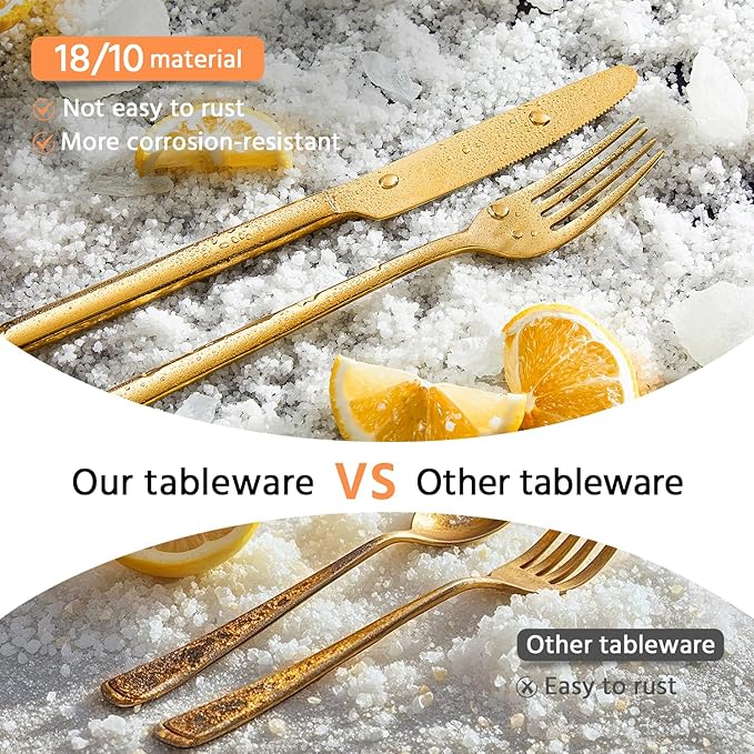 - 18/10 Gold Stainless Steel & Comfortable: Our flatware sets are made of decent quality 18/10 stainless steel, nice balanced, sturdy and corrosion resistant. Thickened handles are comfortable to grip and not easy to bend