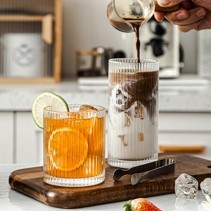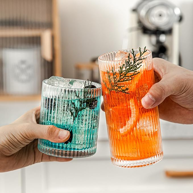 Set of 8 Ribbed Glassware, 4 Large Glasses 13 oz, 4 Rocks Glass Cups 10 oz