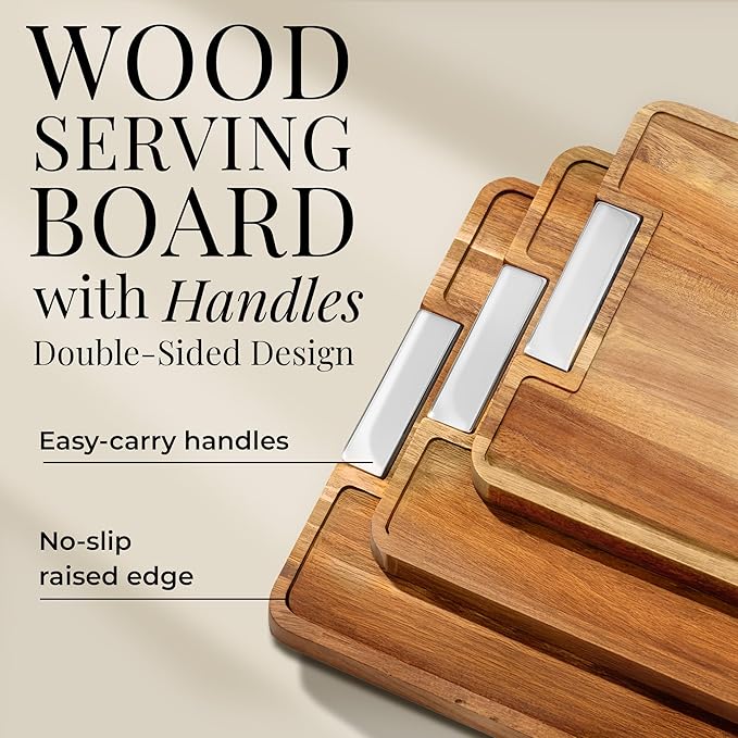 - ACACIA WOOD BEAUTY, CHEF-GRADE DURABILITY: Crafted from premium, pre-oiled acacia wood, these wooden cutting boards for kitchen bring rustic elegance and lasting performance to your meal prep. Naturally non-toxic and gentle on knives.