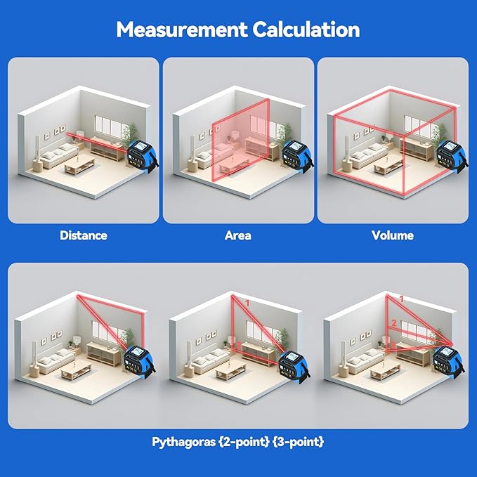 - [Multi-Function Measurement Mode] Switch between single measurement, continuous measurement, area measurement, volume measurement, and Pythagorean measurement modes. Stores up to 50 measurement records, switching between feet, inches, and meters. Ideal for large areas such as rooms, apartments, buildings, real estate, factories, warehouses, and more.