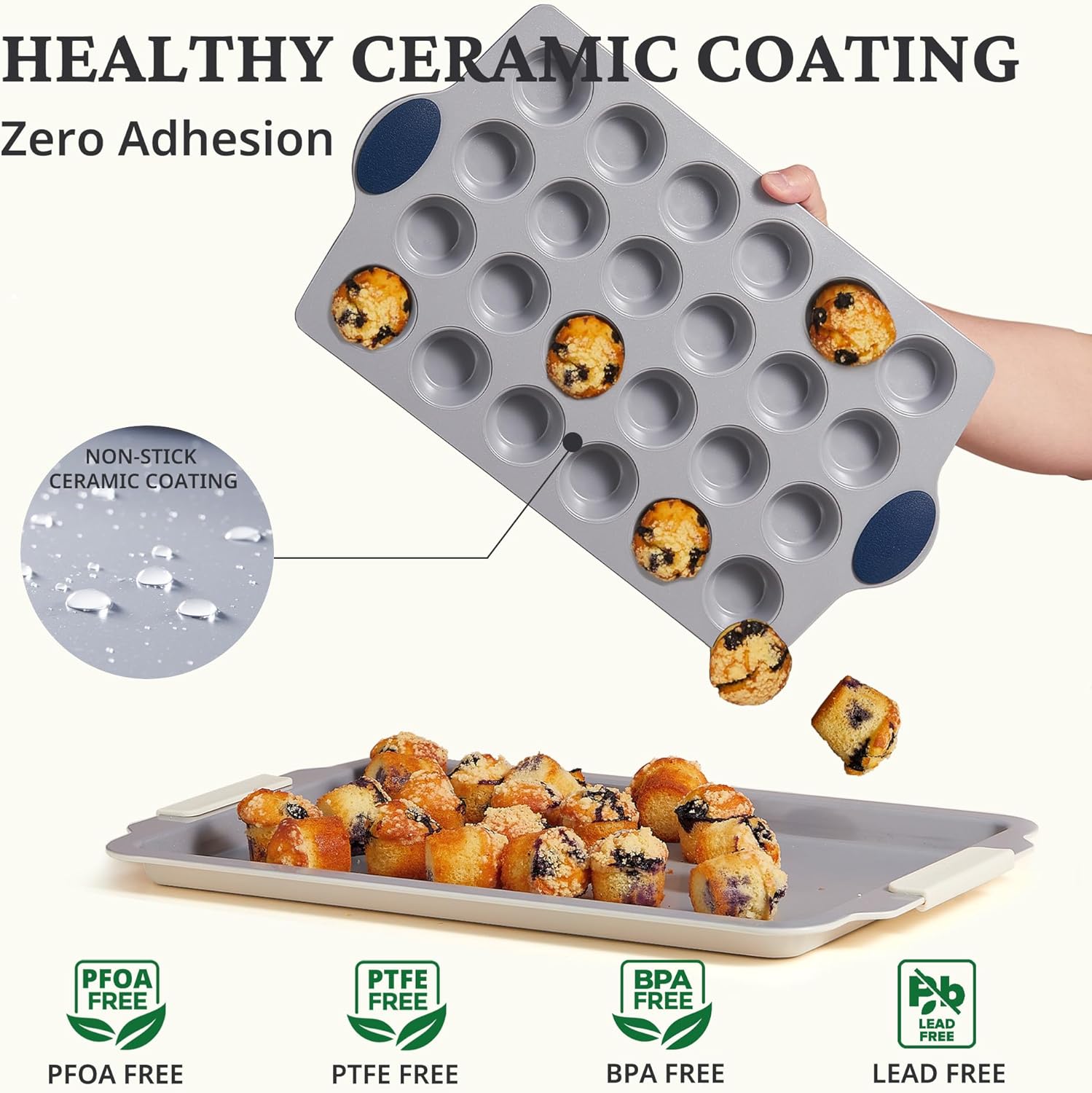 - Healthy Ceramic Coating : This ceramic mini muffin pan nonstick 24 features a non-toxic ceramic coating, free from PTFE, PFOA, PFAS, lead, and other harmful substances. Every baking session is safe and healthy, allowing you to enjoy your delicious creations with peace of mind.