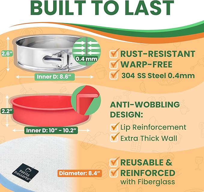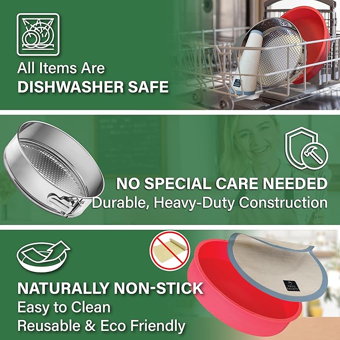 - EFFORTLESS CLEANUP & LOW MAINTENANCE – Save time with our DISHWASHER-SAFE springform pan stainless steel and two silicone items designed for hassle-free maintenance. The stainless steel resists stains and odors, while the non-stick silicone material ensures quick and easy post-baking cleanup.