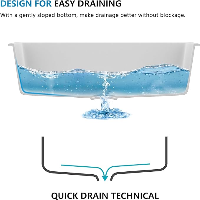 - 〓 Noise Defend/Fast Drainage - Thick granite quartz composite construction is naturally sound deadening, effectively eliminating vibrations, the sharp sound of running water or the echo of falling dishes and cups. R15 large curved corners, easy to clean and reduce stain residue, slightly sloped inner bowl allows the white quartz sink to drain quickly.