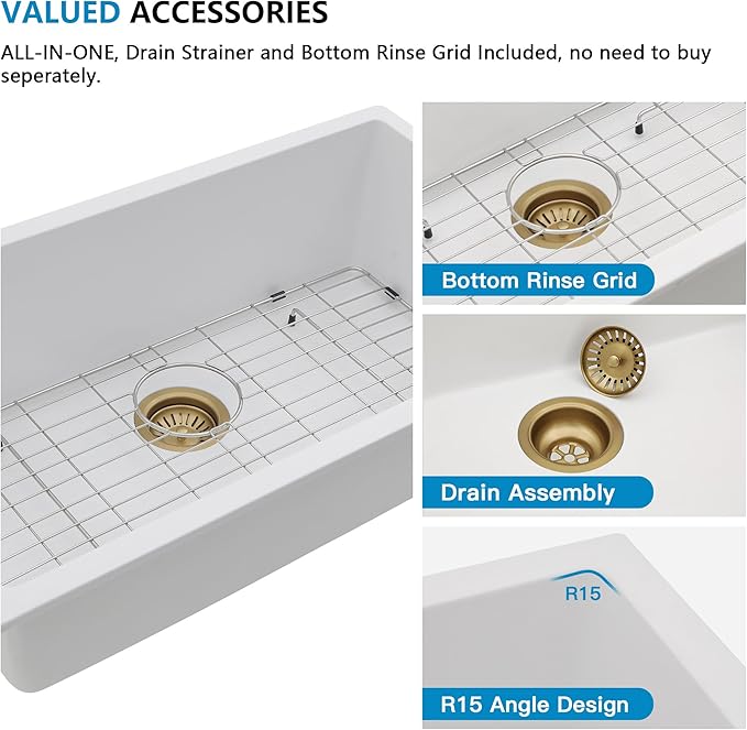 - 〓 31 inch undermount granite kitchen sink is made of premium quartz composite material (natural quartz crystals and acrylic resin, etc.) with a hard, smooth, compact and non-porous finish as real stone, highly resistant to chips, fades and scratches, easy to clean and maintain. Classic quartz pure white color definitely makes it the perfect indispensable addition to your kitchen.