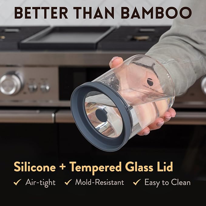 - Silicone Lid Superiority: Silicone lids take up less space than bamboo inside the container for extra storage, are airtight, won’t damage glass taking them on and off, and are non-slip with raised borders making them stackable for kitchen organization