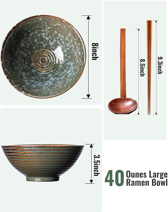 8 Inch 40oz Large Japanese Ramen Bowl Set of 2,Material Safety Ceramic Ramen Bowls with Matching Chopsticks and Spoons, Pho Bowls Ramen Noodle Bowl for Asian Udon Soup Salad Cereal(Green)