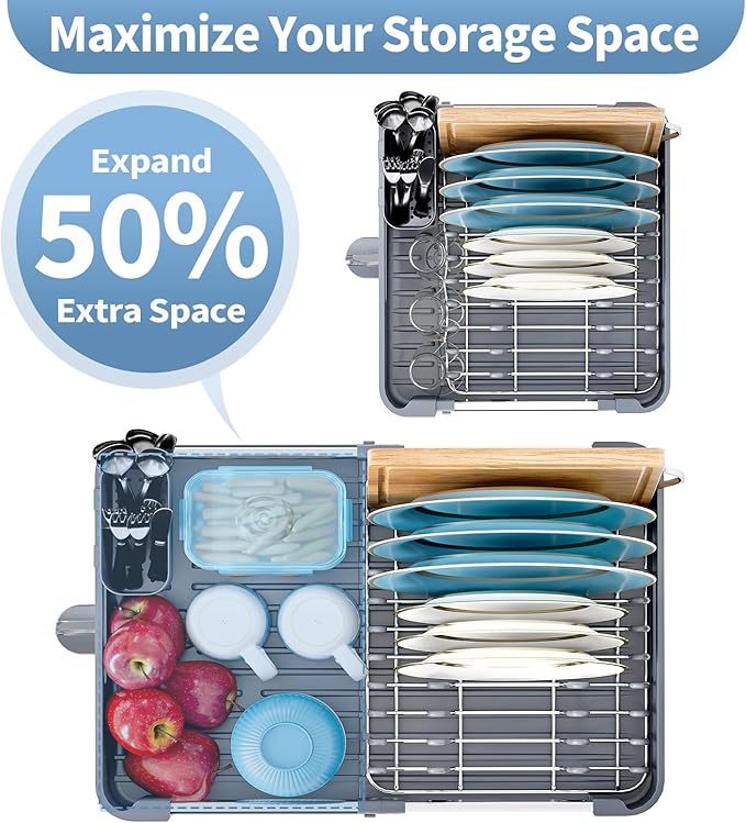 Dish Drying Rack for Kitchen Counter, Extendable Dish Rack with Drainboard, Collapsible Dish Drainer, Expandable Dish Strainer with Cutlery Holder, Foldable Home Countertop Plate Storage Rack, Gray