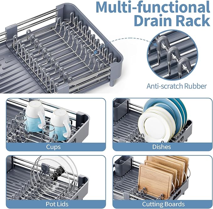 - [ AUTOMATIC DRAINAGE SYSTEM ] Urackify expandable dish drainer holder comes with a fast-draining spout drainboard, together with innovative design for avoiding water accumulation and leakage, Your countertop storage will always be more convenient and tidy