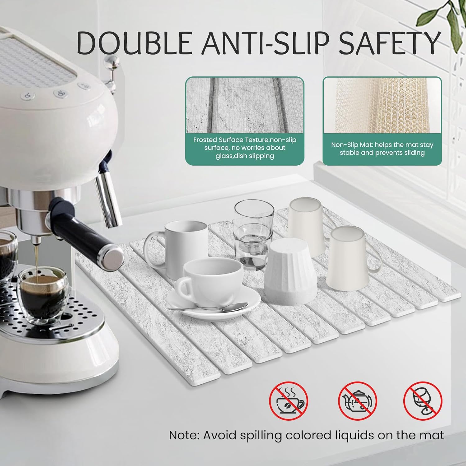 - 【Attention】:Avoid spilling dark liquids on the absorbent mat such as chili oil,soy sauce,red wine,etc.Due to stone drying mat its foldable design,there is a small spine between each panel,if the dishes or items carry a lot of water,which a lot of water will accumulate between the small spine,which is a normal phenomenon;our suggestion for this is to gently shake off the water from the washed utensils or items before placing them on the mat, or to gently wipe the accumulated water on the spine with a dry towel.