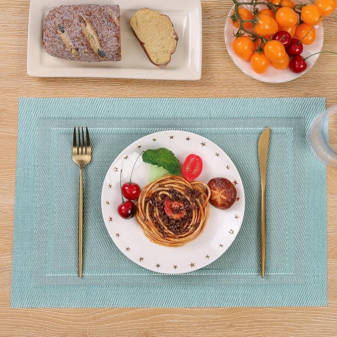 SHACOS Woven Vinyl Placemats Set of 6 Wipe Clean Place Mats for Dining Table Heat Resistant PVC Weave Table Mats Indoor Outdoor (6, Frame Light Turquoise)
