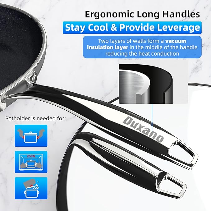 - Rapid & Even Heat Distribution: The high-pressure stamped, thick-gauge pure aluminum base ensures rapid and even heat conductivity from end to end. Say goodbye to uneven cooking caused by dead zones or hot spots. Enjoy precise and consistent heat distribution, allowing you to achieve professional-level results with every dish. From searing to simmering, the DUXANO cookware set delivers consistent heat balance for flawlessly cooked meals.