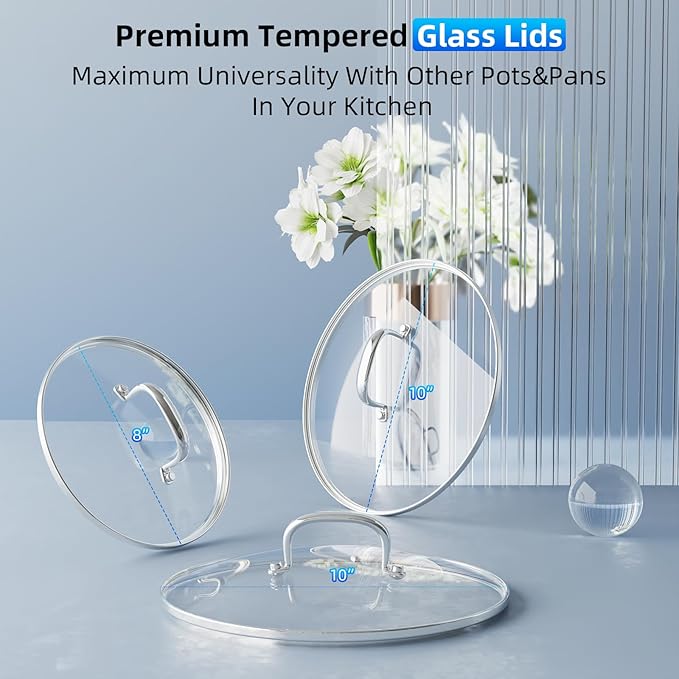 - Premium Tempered Glass Lids: The ceramic cookware set features three premium shatter-resistant glass lids that seamlessly fit multiple pots and pans. With a small ventilation opening for safe steam release during cooking, these glass lids are oven-safe up to 350°F and dishwasher-safe, providing convenience and versatility. The widened handle design of stainless steel ensures a more comfortable grip when lifting the lid.