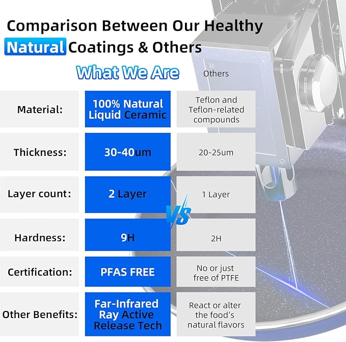 - 9H Diamond-Level Enhanced Coating: The coating achieves 9H hardness, ensuring exceptional resistance to wear, corrosion, and acids. Please note that our ceramic coating serves as an alternative to Tef*l*on. While it’s equipped with ultra non stick feature, it's not *chemically* nonstick.
