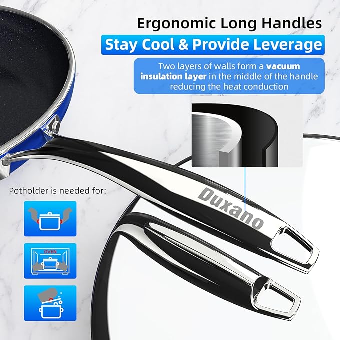 - Rapid & Even Heat Distribution: The high-pressure stamped, thick-gauge pure aluminum base ensures rapid and even heat conductivity from end to end. Say goodbye to uneven cooking caused by dead zones or hot spots. Enjoy precise and consistent heat distribution, allowing you to achieve professional-level results with every dish. From searing to simmering, the DUXANO cookware set delivers consistent heat balance for flawlessly cooked meals.