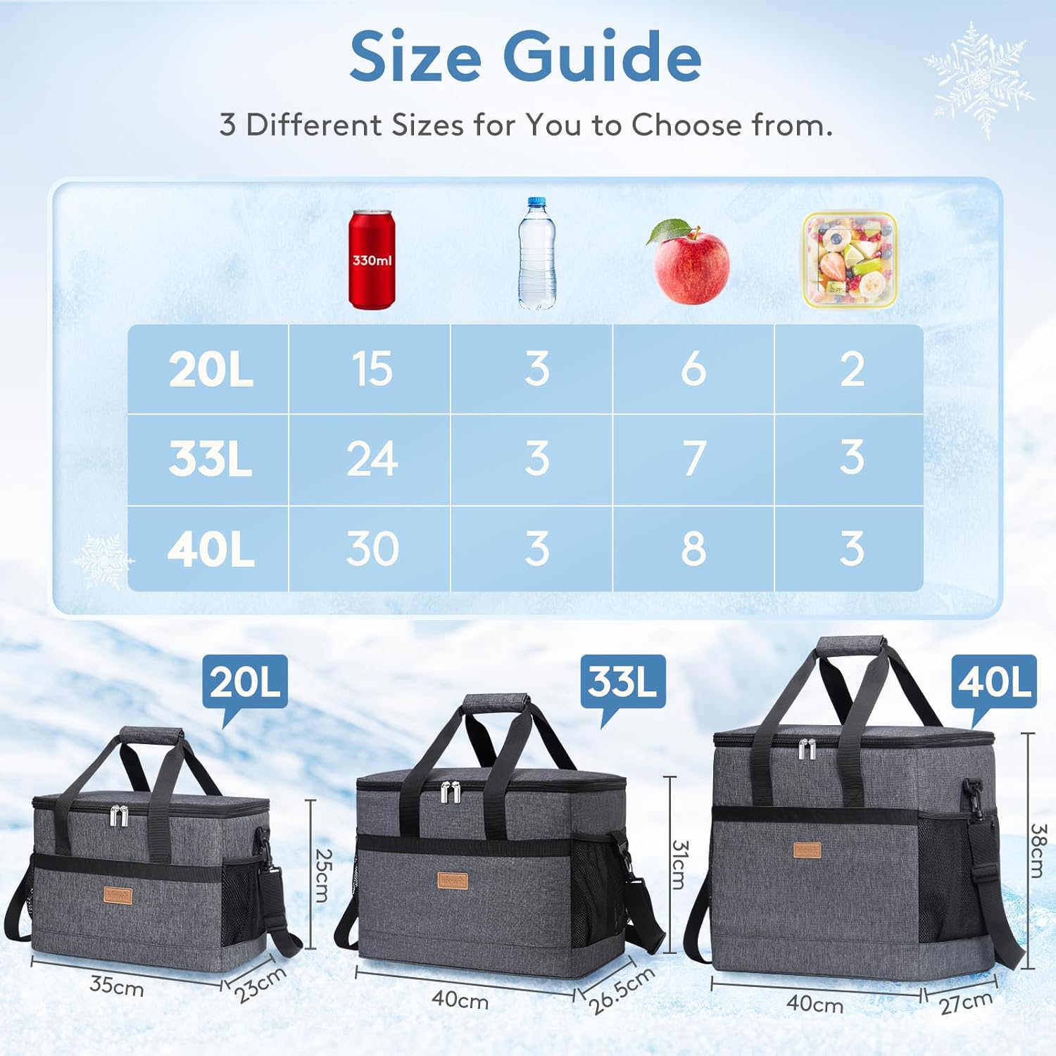 - Measurements: The cooler bag can hold up to 40 Liters (10.5 gallons) by volume; The overall dimensions of the lunch bag are 15.7"(40cm) × 10.6"(26.5cm) × 14.9"(38cm)