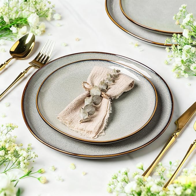 - EVERY PLATE IS UNIQUE: This dinerware set are fired with two different glazes, so the surface develops a beautiful color and makes your food looked even more delicious. The reactive glaze makes every plate unique. Since our glaze is all-natural, it tends to change color depending on the lighting. The color may be a tad different from what you see on your screen, but every item is beautiful. Our glaze is also extra strong to prevent scratches from your knives and forks.