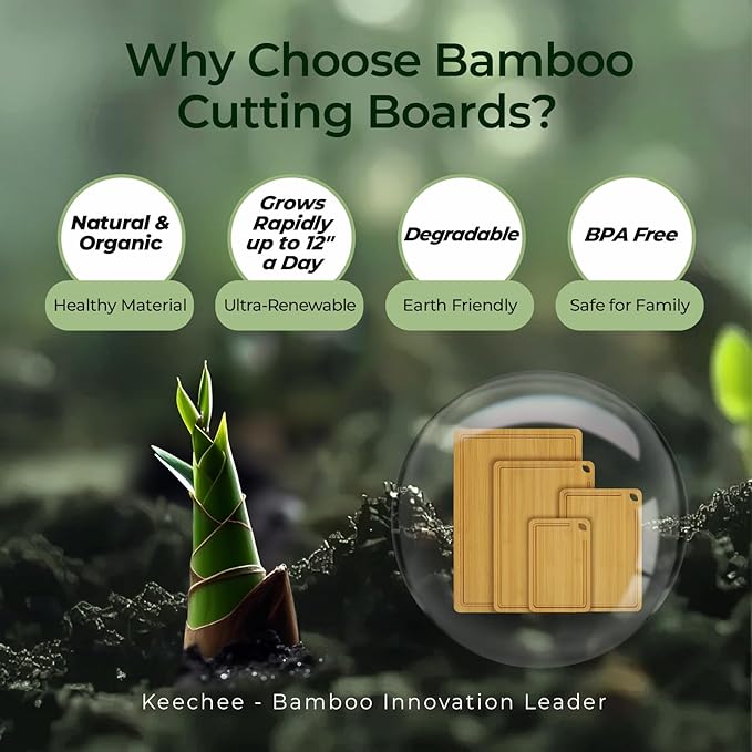 - πππππ ππ πππ ππππ - Keechee's cutting board set is crafted from sustainably harvested quality bamboo forests(Bamboo grows quickly and a single bamboo can be harvested multiple times). Known for its natural strength and eco-friendliness, our bamboo provides a durable and environmentally responsible choice for your kitchen.