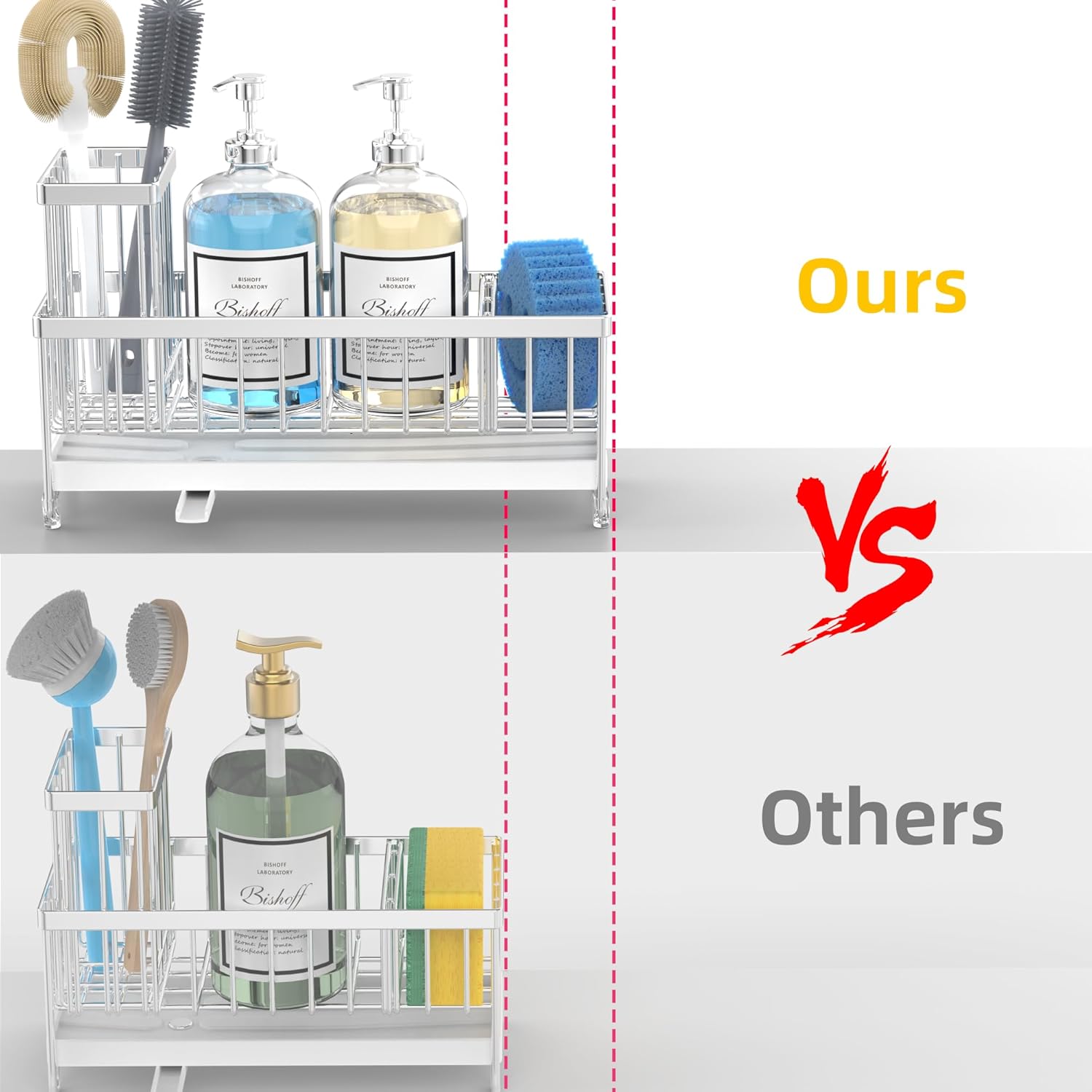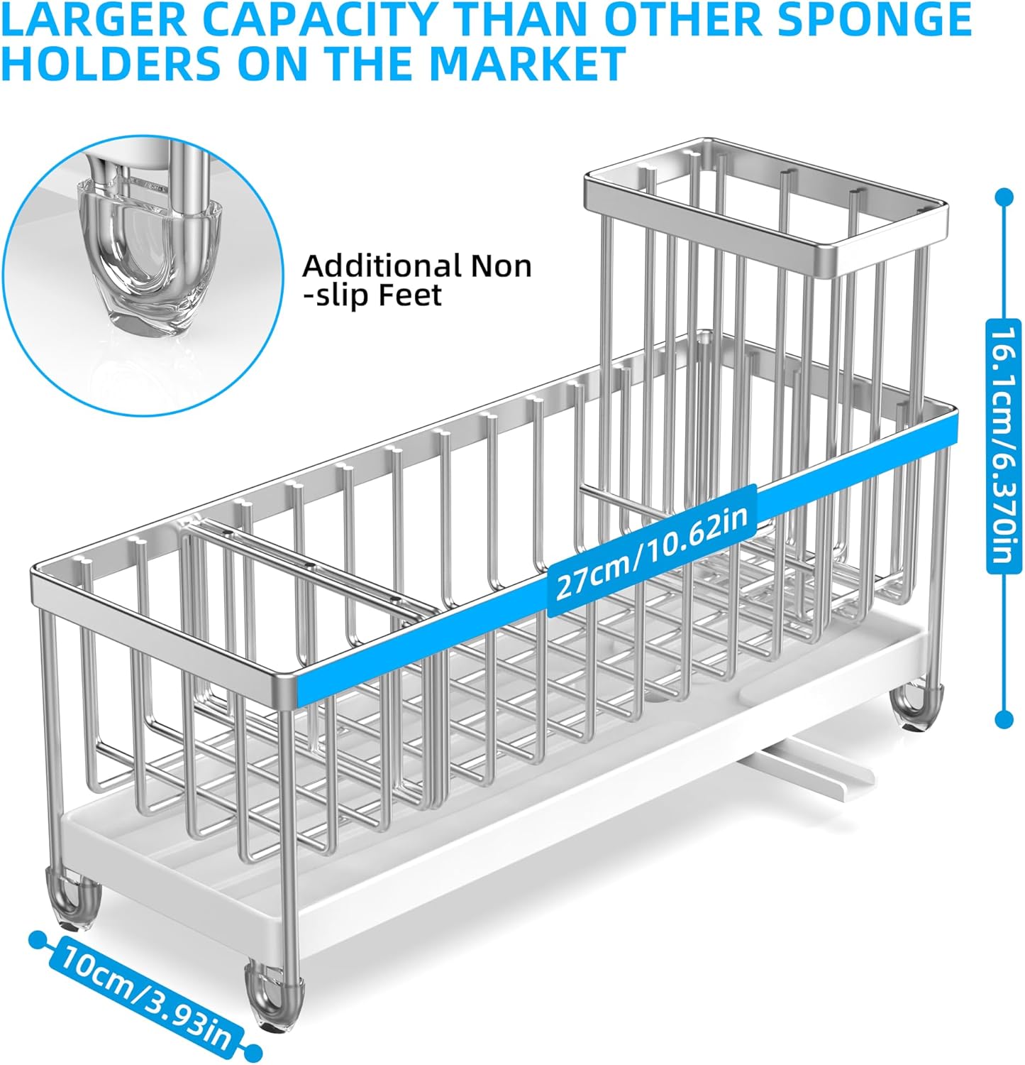 - ăLENGTH UPGRADE LONGER VERSIONăMoforoco Lengthen sponge holder has increased the length by 1.37 inches compared to the regular 9.25-inch length on the market, and the total length is 10.62 inches. It means you can accommodate 2 * soap dispenser bottles, 4* brushes, and a sponge, making your storage space easier, accommodating more of your items and saying goodbye to clutter.