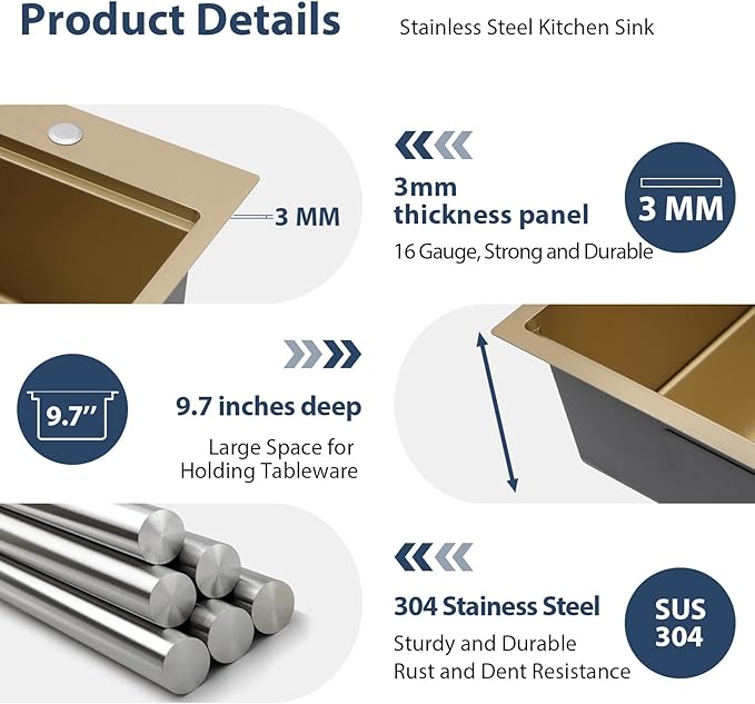- Quiet Drop In Gold Kitchen Sink - Enjoy a peaceful kitchen environment with our ultra-quiet design. Thicker noise reduction pads absorb sound from water or tableware, while the thickest full-body coating prevents condensation and dampening in the closet