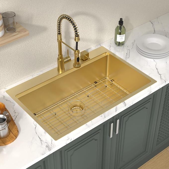 - 16-gauge Thickness With Thickened plate - Elevate your kitchen with the Lordear 33 inch drop in gold kitchen sink, constructed from heavy-duty T304 stainless steel in a robust 16-gauge thickness. Designed to withstand dent, rust, corrosion, and stains, its nano pvd matte gold surface offers exceptional scratch resistance and easier in cleaning. This gold drop in sink 's elegant definitely a success for you kitchen remodeling project