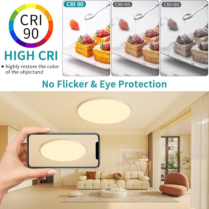 - Natural and Eye-caring: Glowall round ceiling light fixtures adopt high quality LED chips provide a large amount of uniform light without flickering or humming noises, protects your eyes from harsh and glaring lights. With a high color rendering index of 90+, which can make the light closer to the real and original color of the object. Provide you with an extraordinary comfortable bright experience