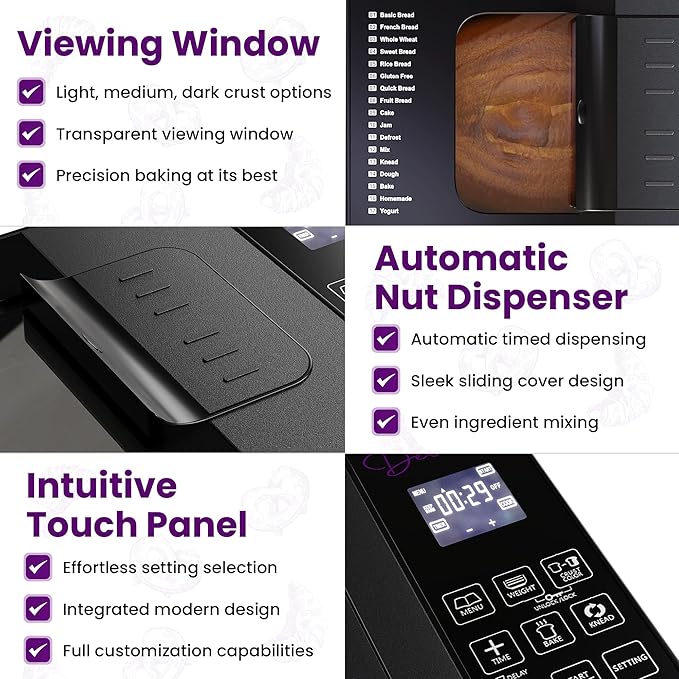 - CUSTOMIZE YOUR BAKING using the horizontal bread machines' DIY program, or choose from our gluten-free bread makers' intuitive touch panel that shows 17 pre-set modes that allow you to make white bread, sourdough, pizza dough, jams, cakes, yogurt, and more