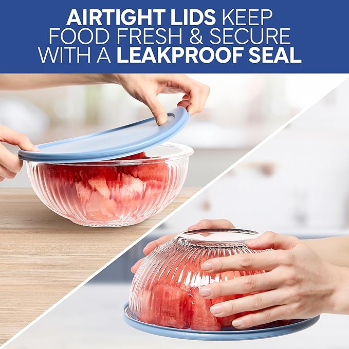 - Complete 12-Piece Set: Includes 6 glass mixing bowls with 6 ombre-colored, airtight lids – perfect for food storage, meal prep, and serving all in one. The set includes bowls with capacities of 26.72 oz, 36.85 oz, 53.25 oz, 70.67 oz, 92.66 oz, and 149.85 oz, all made from high borosilicate clear glass with colored lids.