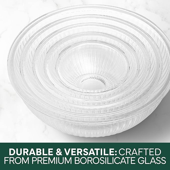 - Complete 12-Piece Set: Includes 6 glass mixing bowls with 6 ombre-colored, airtight lids – perfect for food storage, meal prep, and serving all in one. The set includes bowls with capacities of 26.72 oz, 36.85 oz, 53.25 oz, 70.67 oz, 92.66 oz, and 149.85 oz, all made from high borosilicate clear glass with colored lids.