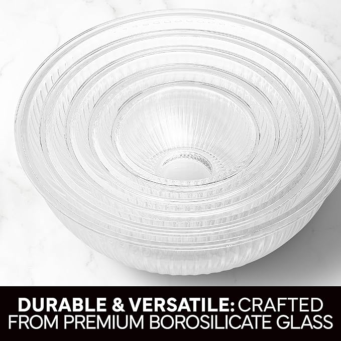 - Complete 12-Piece Set: Includes 6 glass mixing bowls with 6 ombre-colored, airtight lids – perfect for food storage, meal prep, and serving all in one. The set includes bowls with capacities of 26.72 oz, 36.85 oz, 53.25 oz, 70.67 oz, 92.66 oz, and 149.85 oz, all made from high borosilicate clear glass with colored lids.