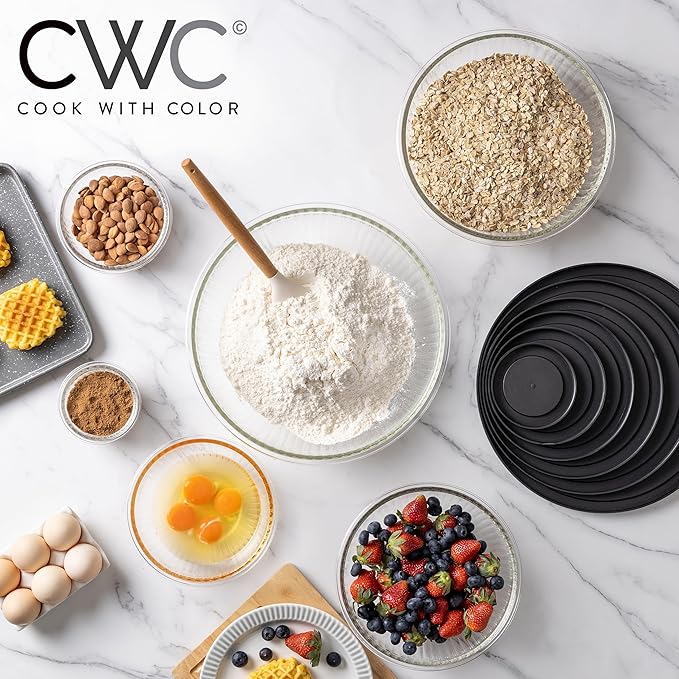 COOK WITH COLOR 12 Pc Glass Mixing Bowl Set with Lids – Borosilicate Glass Nesting Bowls for Cooking, Baking and Meal Prep, Fluted Black